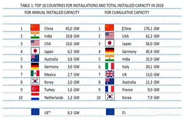 圖:2018年全球新增裝機和累計裝機排名前10位的國家