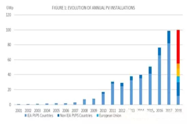 近年來,中國光伏市場的發展水平在很大程度上推動了全球光伏市場的發展。然而,盡管中國光伏市場在2017年之前一直在增長,但在2018年經歷了小幅的下滑。然而,中國光伏市場的這種下滑,并未對全球光伏市場產生較大影響,相反全球光伏市場得到了中國以外地區更大裝機容量的補償。2018年中國新增光伏裝機容量約為45GW,而2017年的新增為53 GW。全球光伏市場呈現穩定態勢,2018年新增裝機容量為99.8 GW,而2017年新增為98.9 GW。