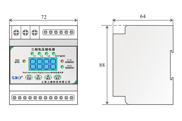 , 無數值顯示。繼電器達到所設定值,動作后,由TIRP動作燈會點亮,實際線路電壓低于或高于所設定的返回值,指示燈切換回來。正常運行情況下,RUN運行燈、電壓設置表示燈常亮。L1、L2、L3來回切換運行。當輸入電壓任意一相滿足動作條件,繼電器動作,電壓標識燈熄滅,表示延時時間已到動作。當輸入接近動作條件時,繼電器進入動作預備狀態,所有芯片資源用來計算輸入值,一旦滿足條件,立即啟動計時,繼電器設有啟動量連續判斷功能和突變量連續判斷功能,能夠有效迅速的判斷輸入值,并躲過短時干擾。
