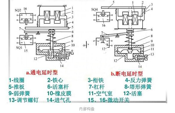 空氣阻尼式時間繼電器,既具有由空氣室中的氣動機構帶動的延時觸點,也具有由電磁機構直接帶動的瞬動觸點,可以做成通電延時型,也可做成斷電延時型。電磁機構可以是直流的,也可以是交流的。