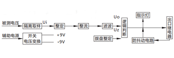被測(cè)電壓經(jīng)過電阻分壓取樣,得到與被測(cè)電壓成比例的取樣電壓Ui , Ui經(jīng)撥盤整定,再進(jìn)行整流濾波,得到直流Uo ,邏輯回將Uo與門坎電壓Uz進(jìn)行比較。對(duì)欠電壓繼電器,若Uo> Uz ,則出口繼電器不動(dòng)作;若Uo