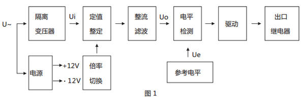 本繼電器為靜態型繼電器,采用進口集成電路構成,被測量的交流電壓U~經隔離變壓器降壓后得到與被測電壓成正比的電壓Ui,經 整定后進行整流,整流后脈沖電壓經濾波器濾波,得到與Ui成正比的直流電壓Uo,在電平檢測中Uo與直流參考電壓 Ue 進行比較,若直流 電壓Uo低于參考電壓,電平檢測器輸出正信號,驅動出口繼電器,則本繼電器處于動作狀態。反之,不論是過電壓繼電器或是低電壓繼電器, 若直流電壓Uo高于參考電壓 Ue,電平檢測器輸出負信號,本繼電器處于不動作狀態。